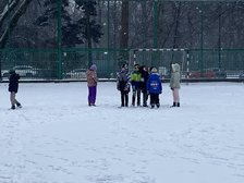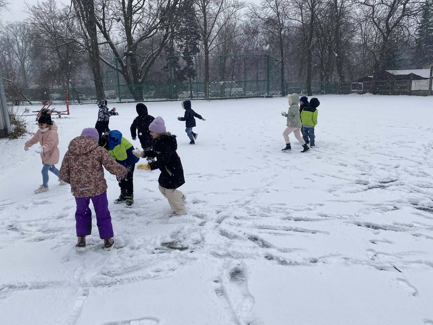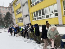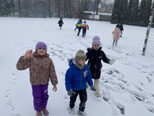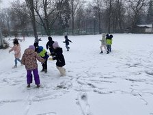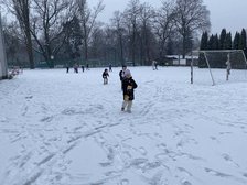 Klasa 1a wykorzystała sprzyjające warunki i ćwiczyła rzut w dal śnieżkami, zabawy integrujące grupę.