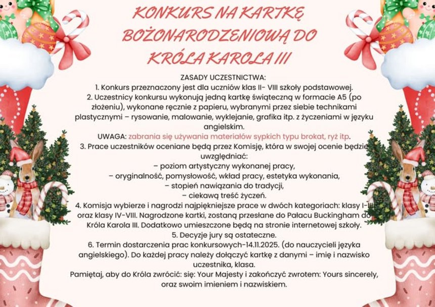 Zapraszamy do udziału w konkursie na kartkę bożonarodzeniową do Króla Karola III ! 06.11.2025 18:43 Iwona Pogoda-Majka /SP 170 wróć do aktualności wydrukuj